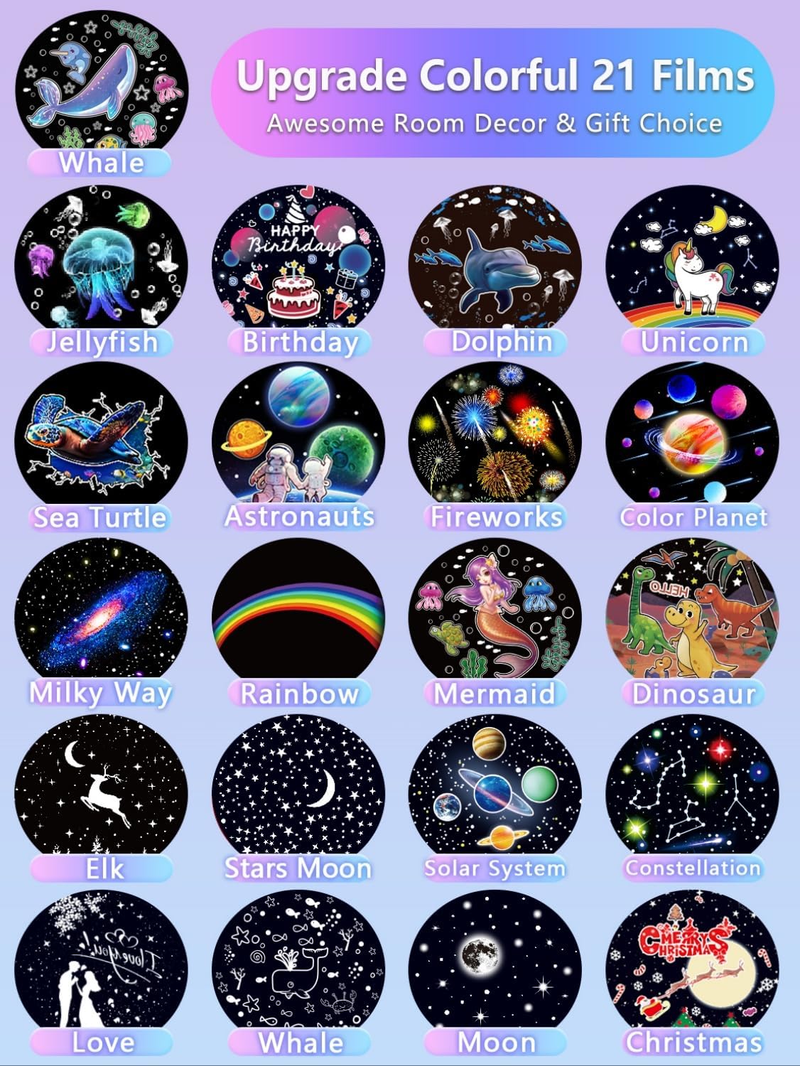 NOISE-FREE KIDS PROJECTOR: This product has 21 sets of film and 6 light colour changes, the projection light is so clear that children can see all the different scenes clearly. The projections are projected onto the ceiling and around the room creating a fantastic starry sky projection light, great kids projection light. The projection light glows in the dark and kids can change the film to travel through the different scenes! Cool projection light, great gift for kids!