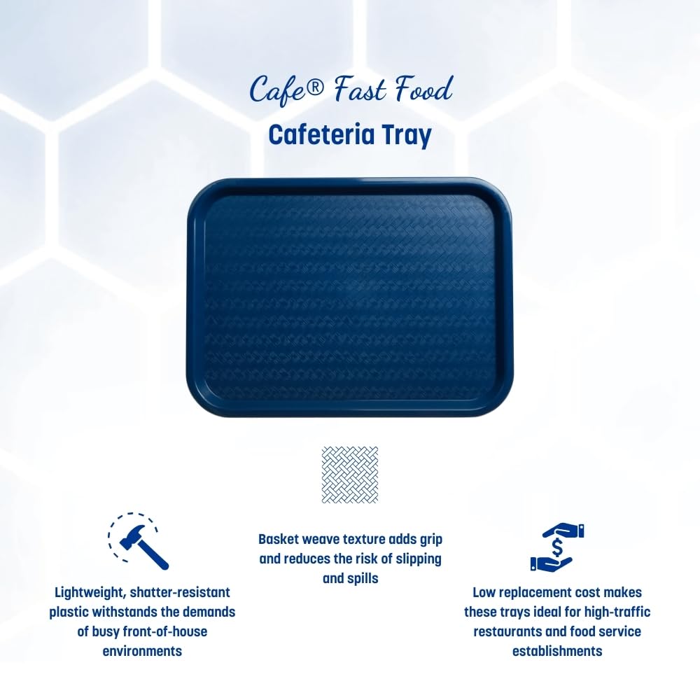 The Cafe Standard Plastic Trays from Carlisle are designed for cafes, school cafeterias and fast-food restaurants alike. Made from lightweight yet durable Blue polypropylene plastic, these economical cafe trays feature a traditional basket weave design resistant to scratching. The unique skid-resistant texturing ensures food stays put during transport.The trays are BPA free and certified by the National Sanitation Foundation.