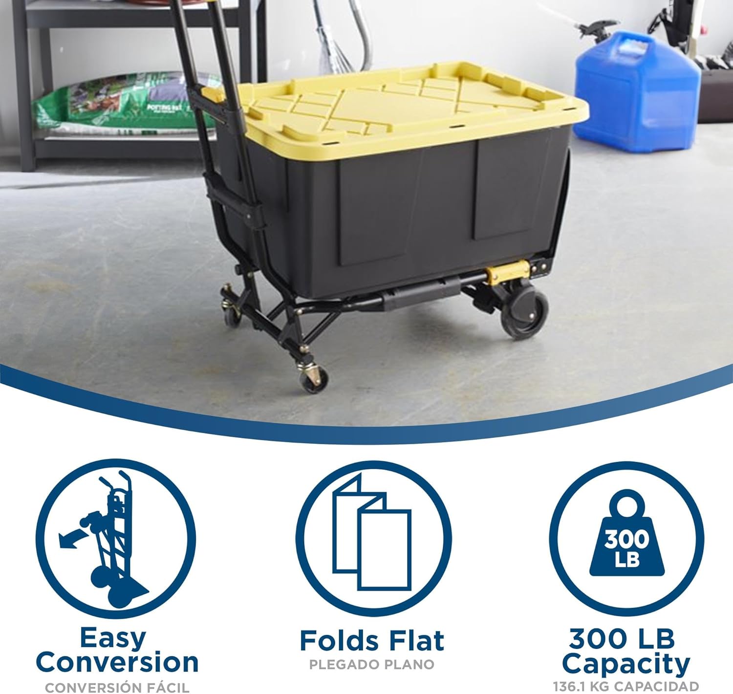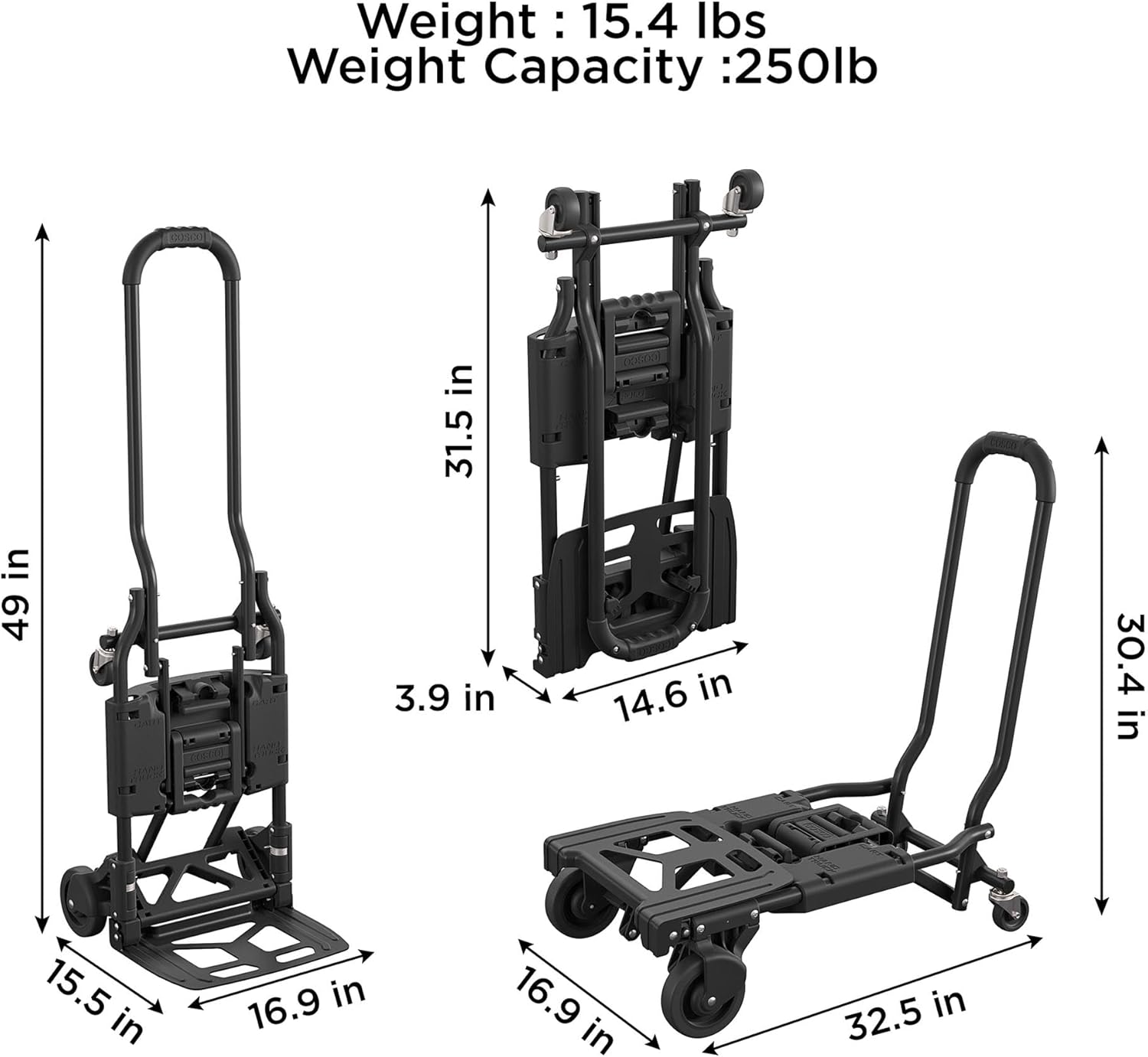 The product is compact, folding flat for storage and fitting easily in car trunks, while being easy to convert between handtruck and dolly modes.