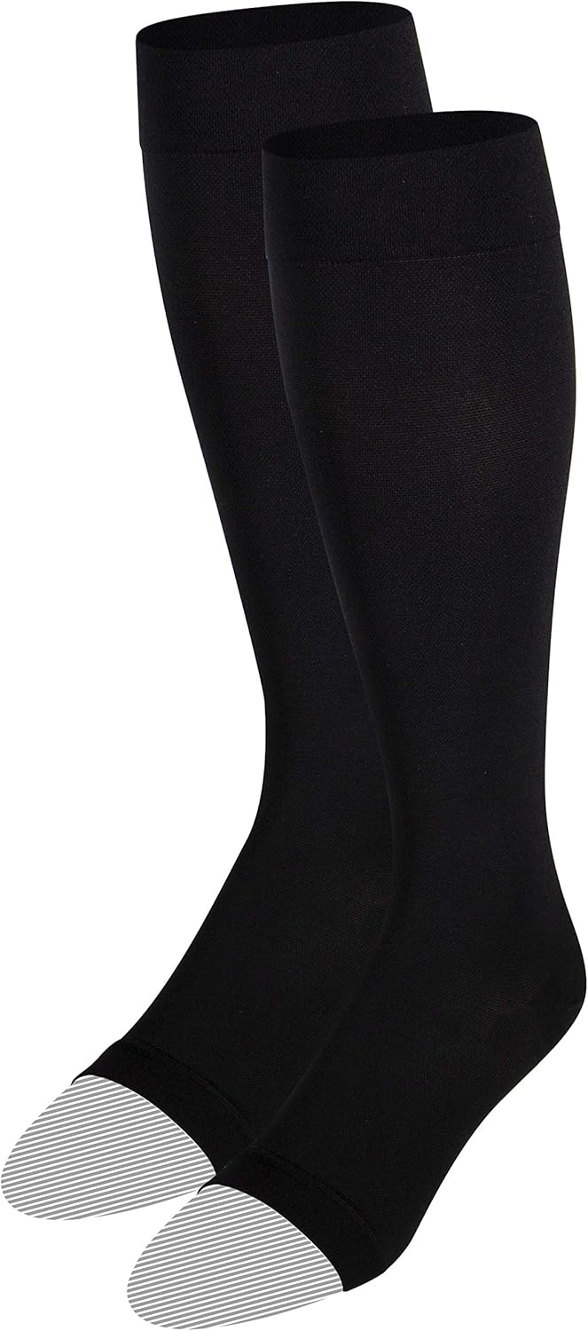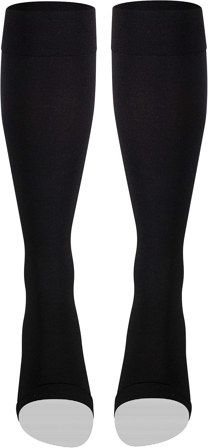 Open Toe foot; Knee high length extends over calf; Wide top band prevents sock from falling down
