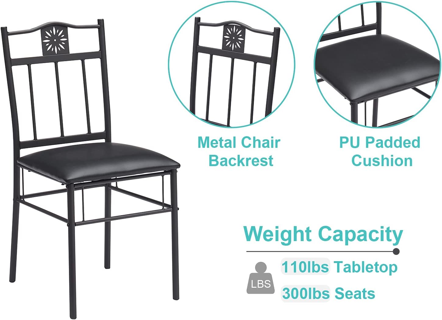 [Comfortable Dining Experience] – With soft PU padded tops and metal frames, the 2 chairs have nice high backs that conform to your body, making this kitchen table set a comfortable addition to any dining room. Each chair has a capacity of 275 lbs.