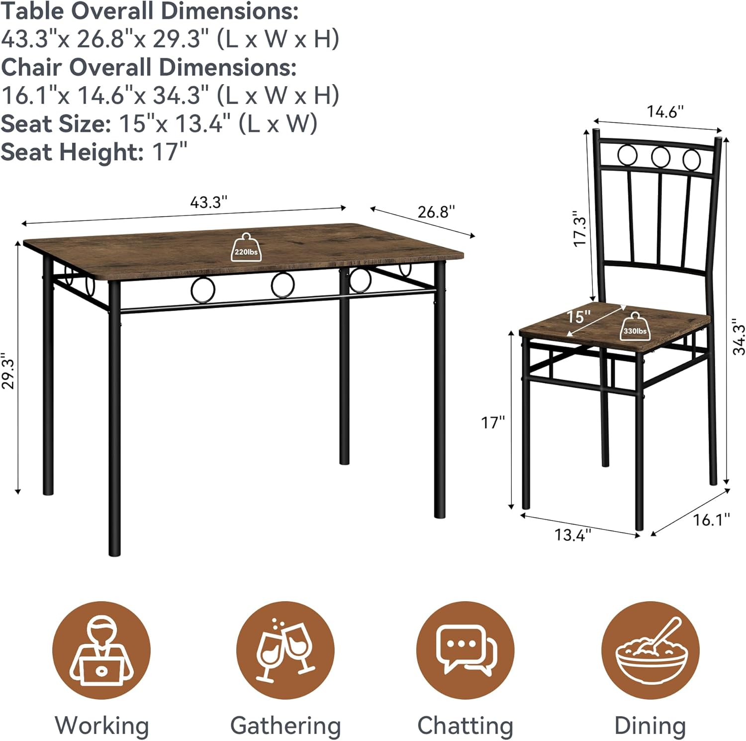 【Sturdy & Stable】 : The dining table and chairs are supported by metal legs and possess a robust structure. Thick planks and strong metal with a smooth finish ensure sufficient weight to offer you a reliable dining experience. The table has a load-bearing capacity of up to 220 pounds, and each chair can withstand a weight of up to 330 pounds.