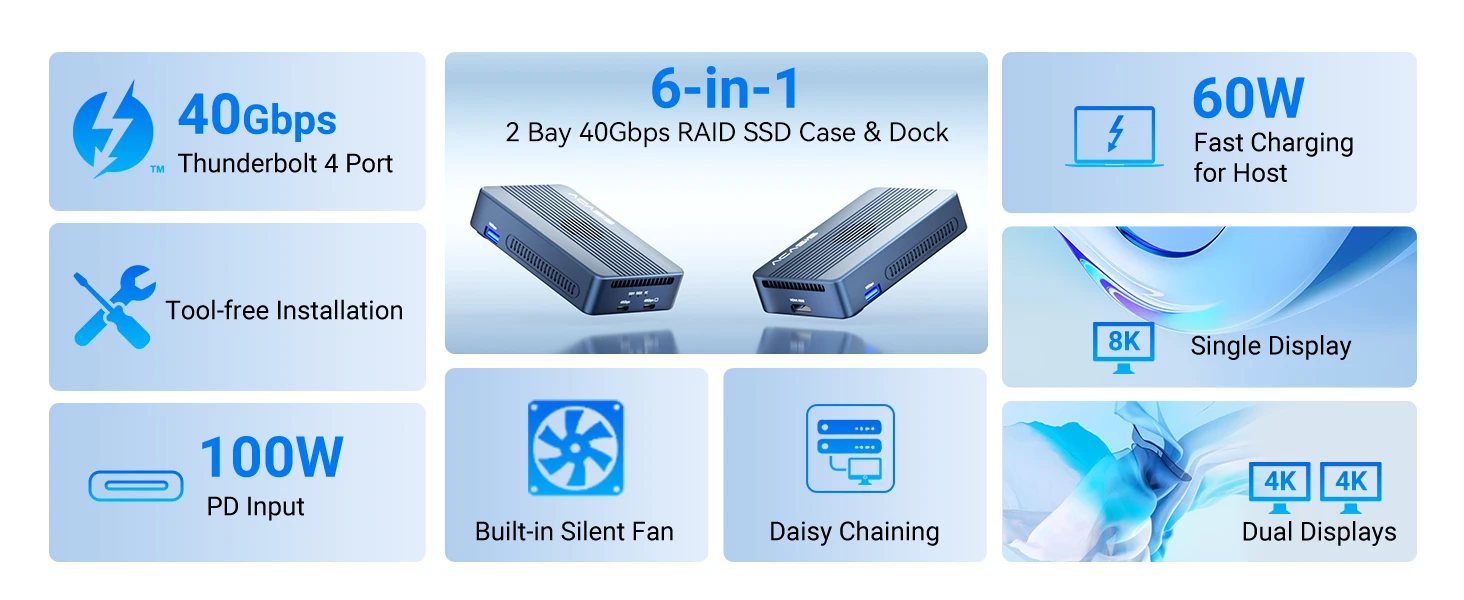 Acasis 40Gbps Dual-bay USB-C Thunderbolt SSD Case Docking Station M.2 NVME Raid Mode SSD Enclosure HDMI 4K 60HZ PD100W Hub
