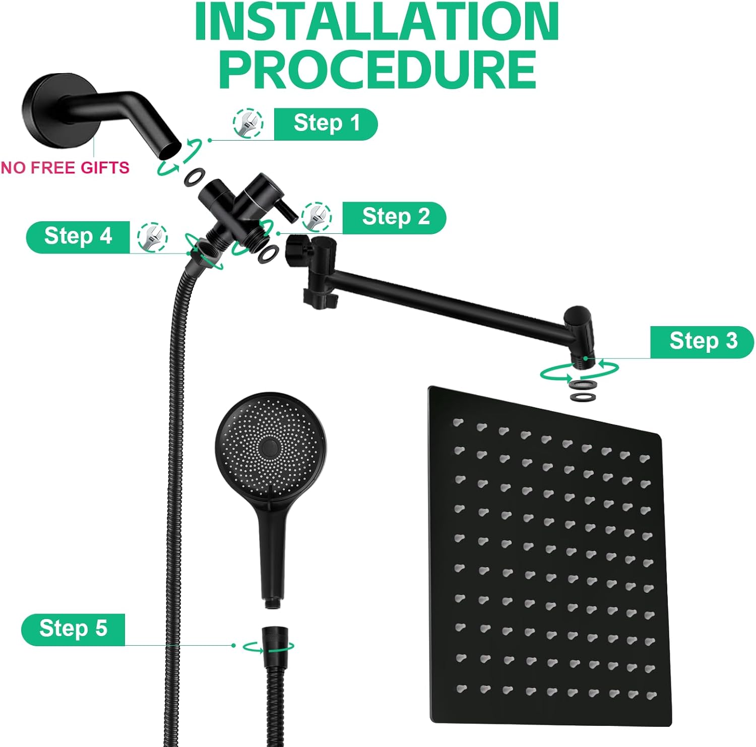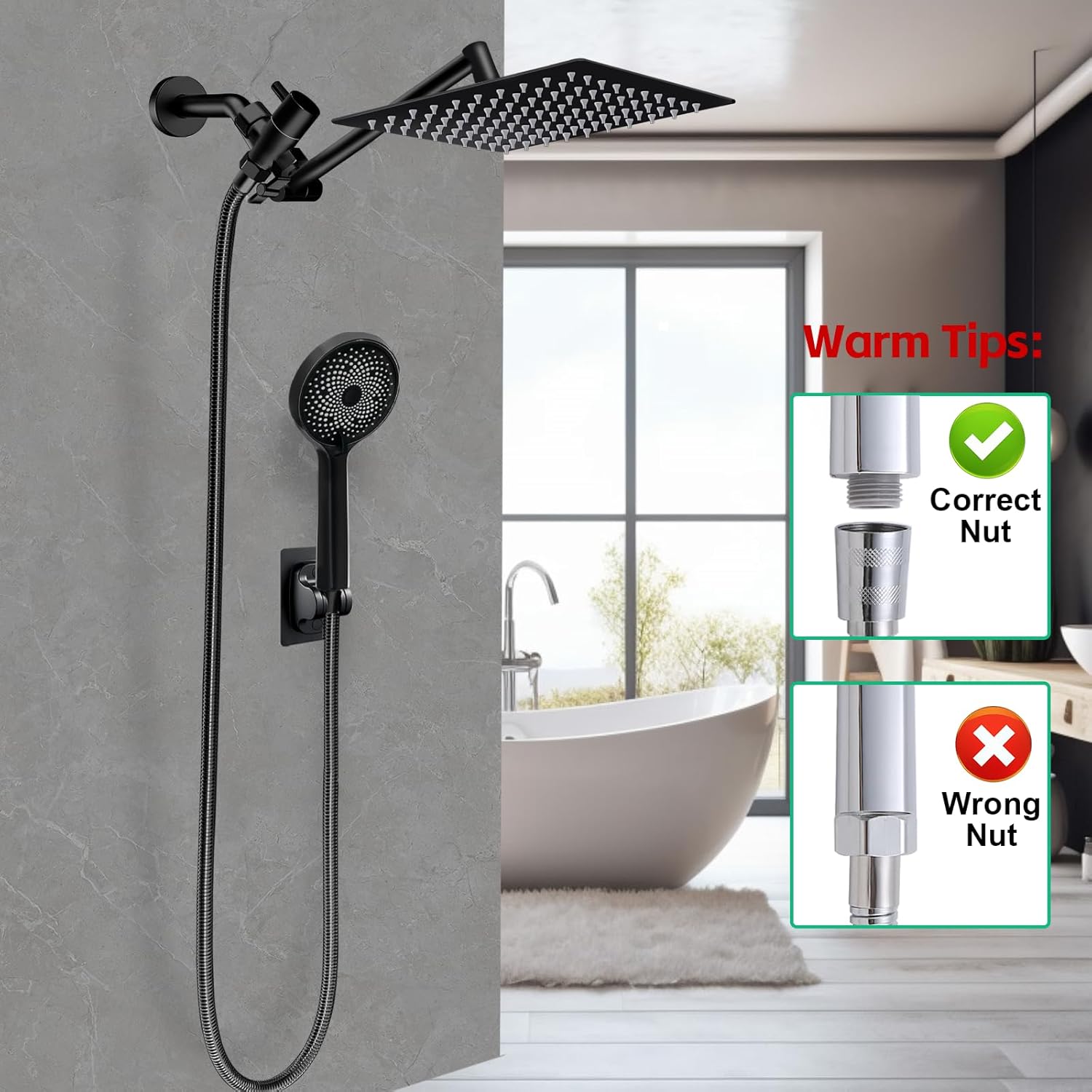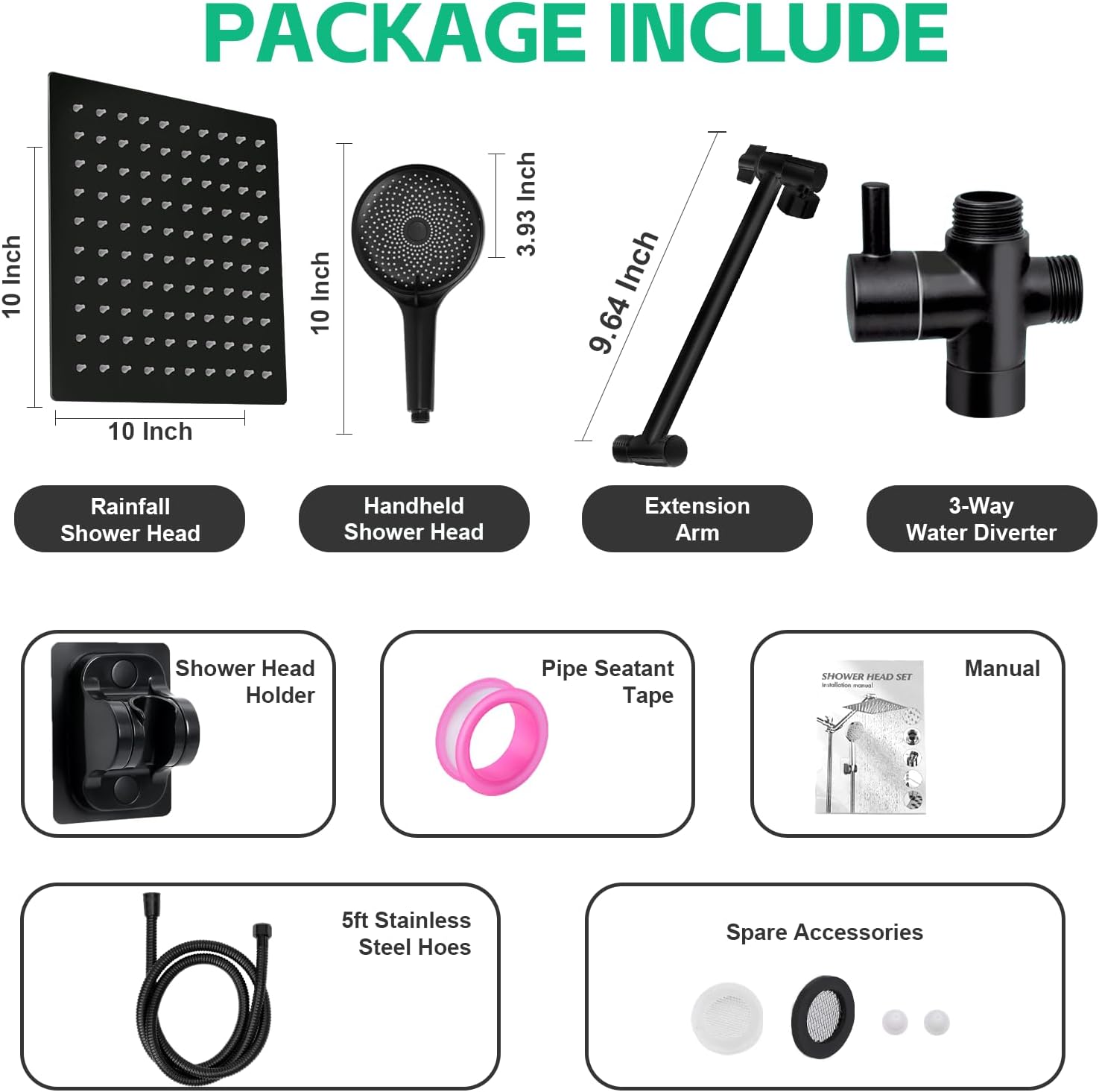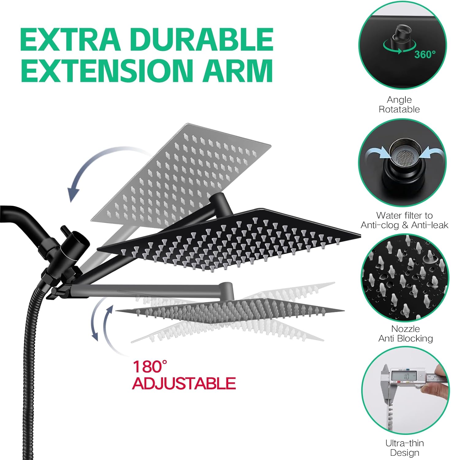 【10 Inch Square Rain Shower】Excellent rain shower system. 304 # stainless steel has high rust resistance and service life. The solid ball nut with 360 degree adjustable rotation angle can realize reliable connection to meet the needs of shower at different angles.
