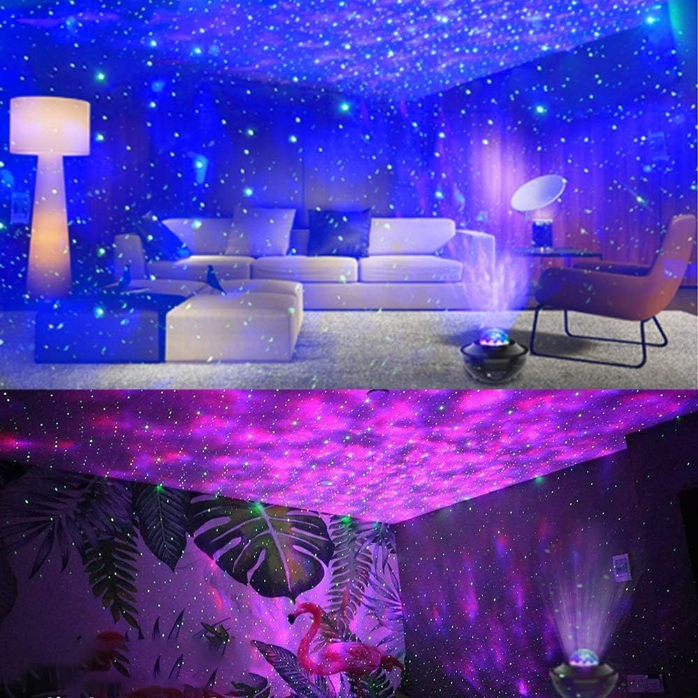 Various Lighting modesYou can choose your favorite colors combined with star lightrs in 10 different lighting modes: Single (Red, Green, Blue,White) and Mixed Colors (White & Red, White & Green, White & Blue, Red & Green, Red & Blue, Green & Blue) that can create a romantic and peaceful atmosphere for your home party entertainment.Remote controlThe remote can control the night light, colorful Lights, adjust brightness, freely turn on/off the lamp, change lighting mode, music songs, timer.Music Player with Sound ActivatedWith the micro on, the latest sound-activated flicker mode allows the projection changing the color according to the music beat or clapping your hands, which would make your parties more fantastic.Note: Please make sure the remote controller pointing at product remote receiving area and remote distance about 12m/39.37ft.