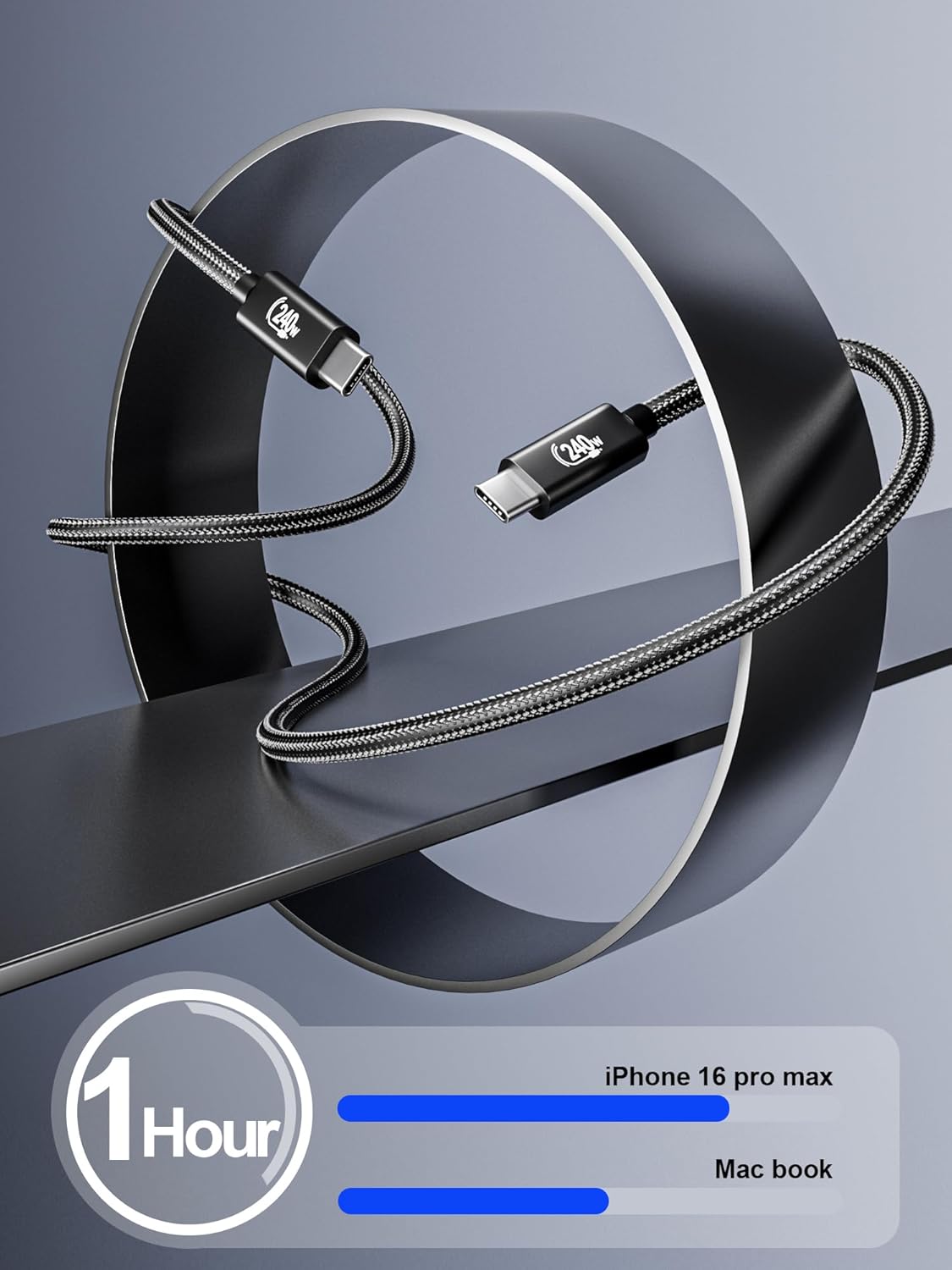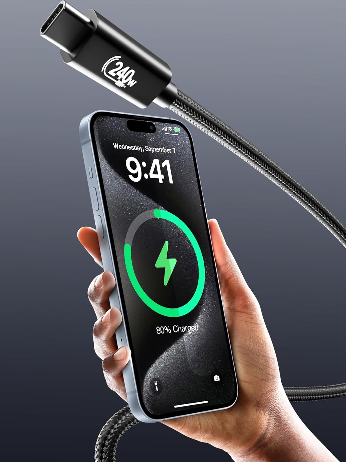 Super Fast Charging: With a maximum output of 240W, this USB C to USB C cable supports PD3.1 and QC4.0 fast charging, powering your iPhone 16 from 0% to 71% in just 30 minutes.