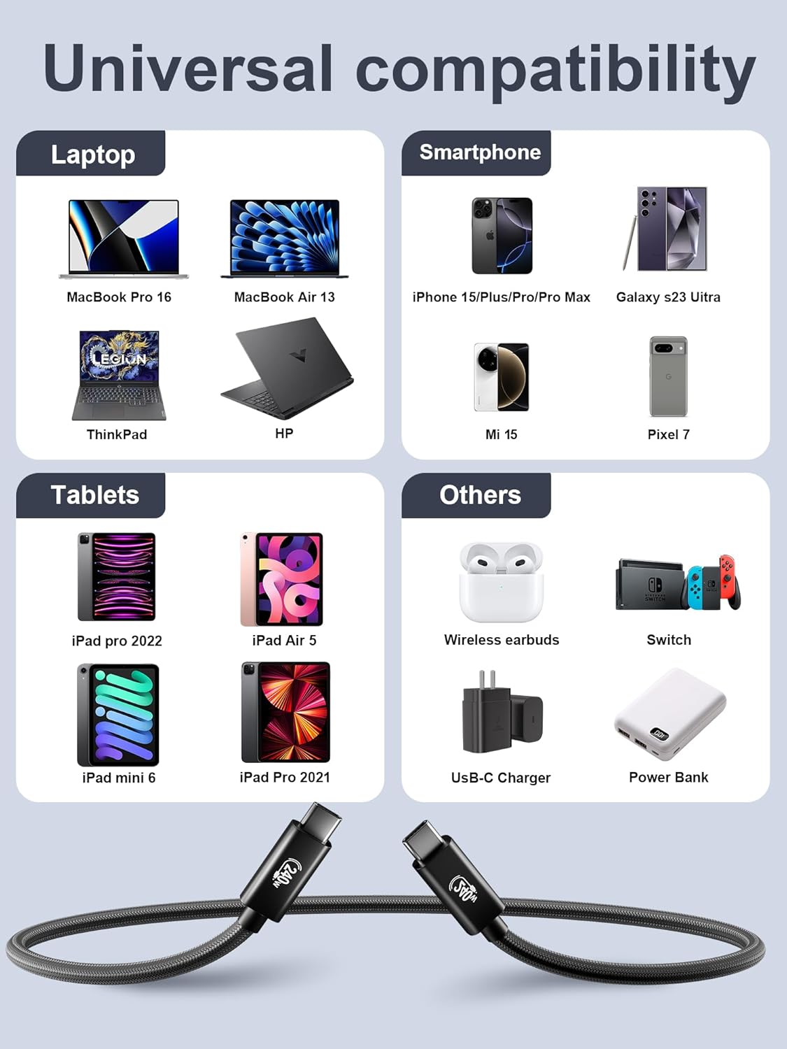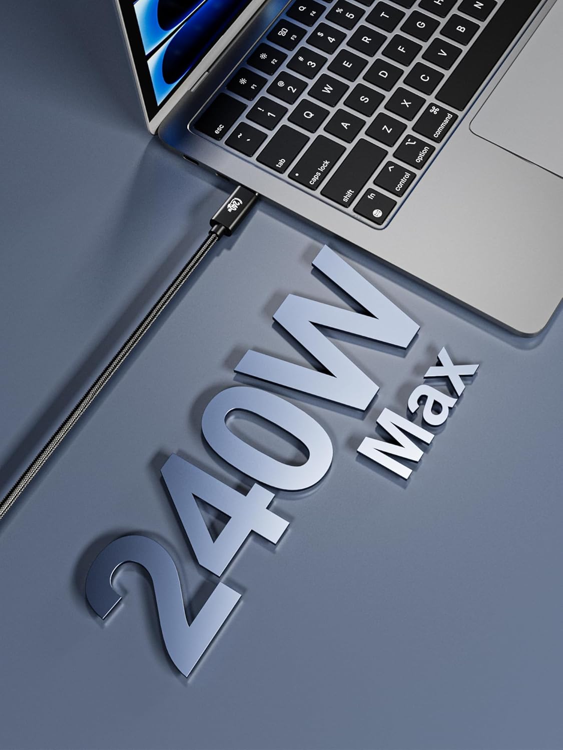 Universal Compatibility: This 240W USB C cable supports devices with a range of power needs, including 140W, 100W, 65W, 60W, 45W, and 20W, making it perfect for fast charging laptops, tablets, smartphones, and more.